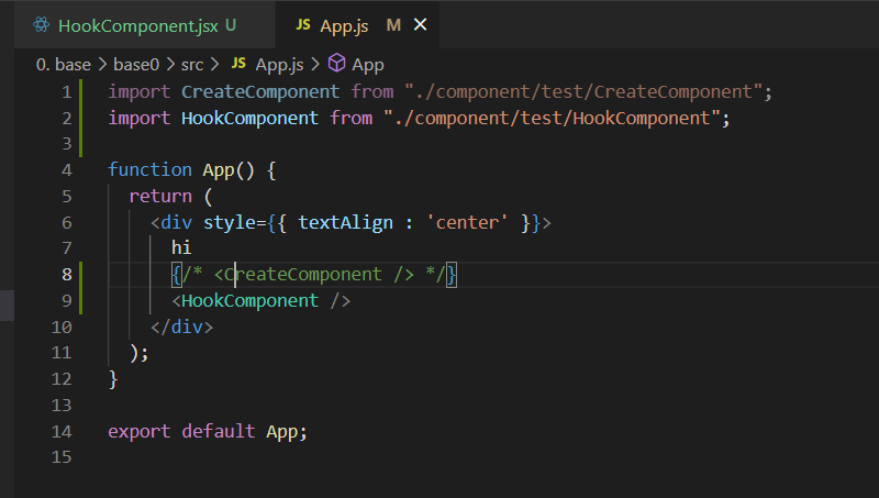 기본 깡통이다.. 위는 새롭게 만든 Hook Component이고, 만든 jsx 파일을 App.js 파일에 넣어줬다.