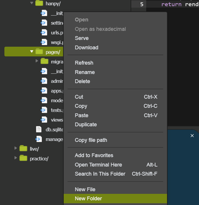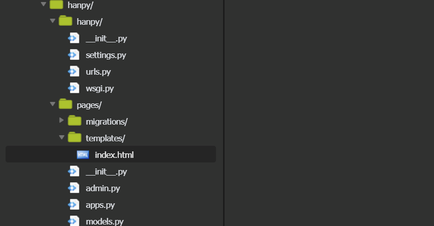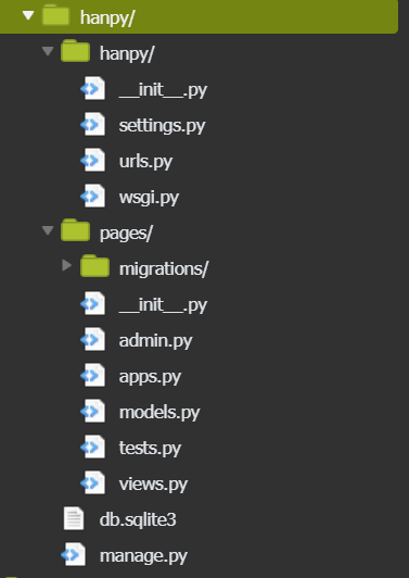 - 위의 사진을 보면 나는 hanpy라는 프로젝트를 만들었고 pages라는 app을 만든 것을 알 수 있다.