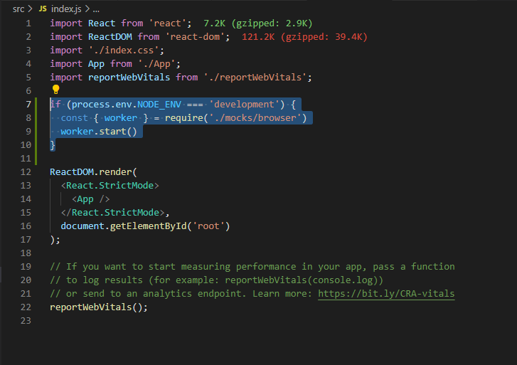 개발환경인 경우에는 mocks 내부의 browser에서 worker를 가져와서 실행한다는 말이다. 쉽게말해서, mock를 사용하지 않고 일반적인 API을 사용하려면 위의 3줄만 지우면 mock가 작동하지 않는다.