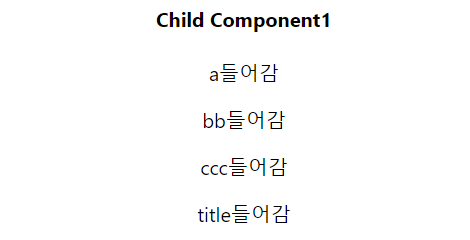 props뒤에 .a나 .title과 같이, 부모 컴포넌트에서 적은 = 왼쪽부분을 넣어주면 된다. 결과 페이지는 아래와 같다.