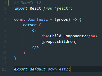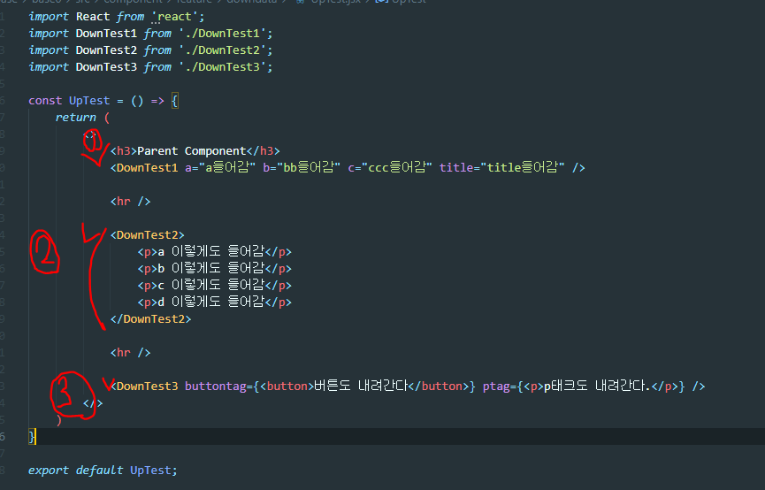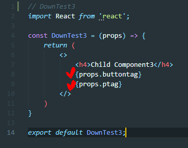 위의 방법은 = 왼쪽에는 DownTest3 컴포넌트에서 사용할 변수를 넣어준다. 오른쪽에는 tag를 직접 넣어준다. DownTest3 코드는 아래와 같다.