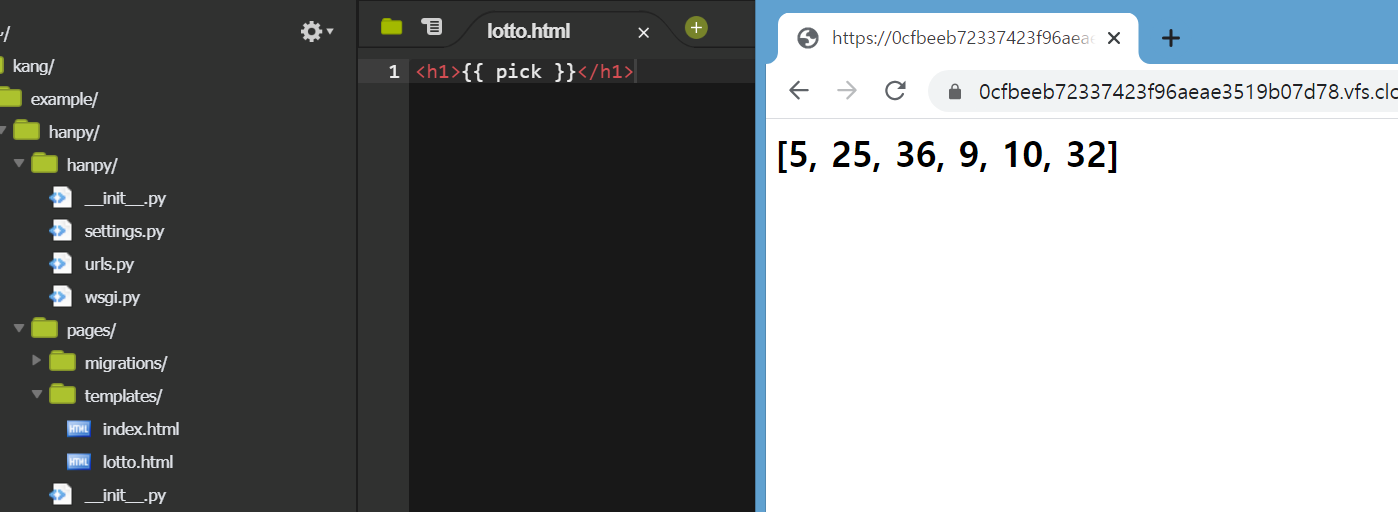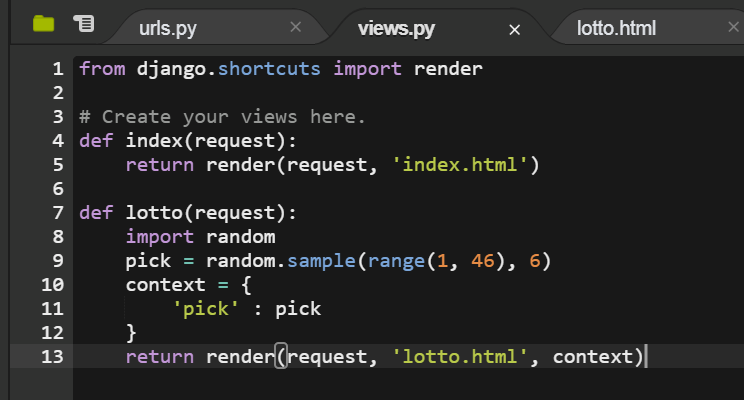 templates에 있는 html 파일을 실행할 때, 적혀있는 lotto.html과 context를 함께 가지고 가서 실행한다.