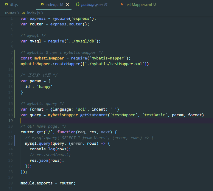 현재 routes/index.js 의 내부를 보면 내부 로직을 controllers/index.js과 models/indes.js로 옮겨서 가독성을 높이고 유지보수에 용이하게 만들어 볼 것이다. (정답은 없다. 아래를 참고해서 응용해서 자신만의 구조를 만들어보자. )