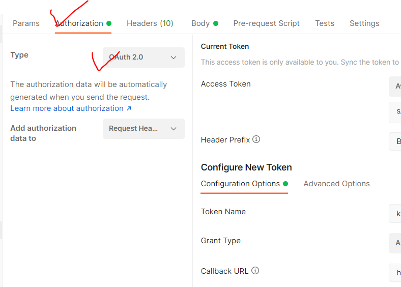 우선적으로 Authorization을 누르고 Type를 OAuth 2.0으로 설정한다.