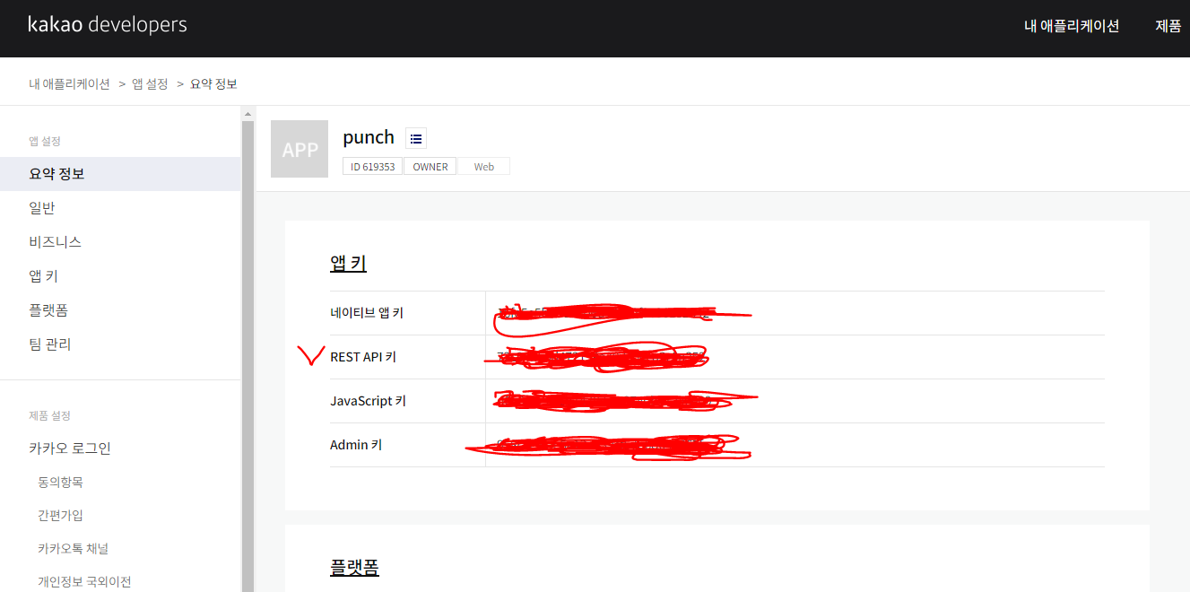 아래와 같이 요약정보에 들어가서 REST API 키를 확인한다.