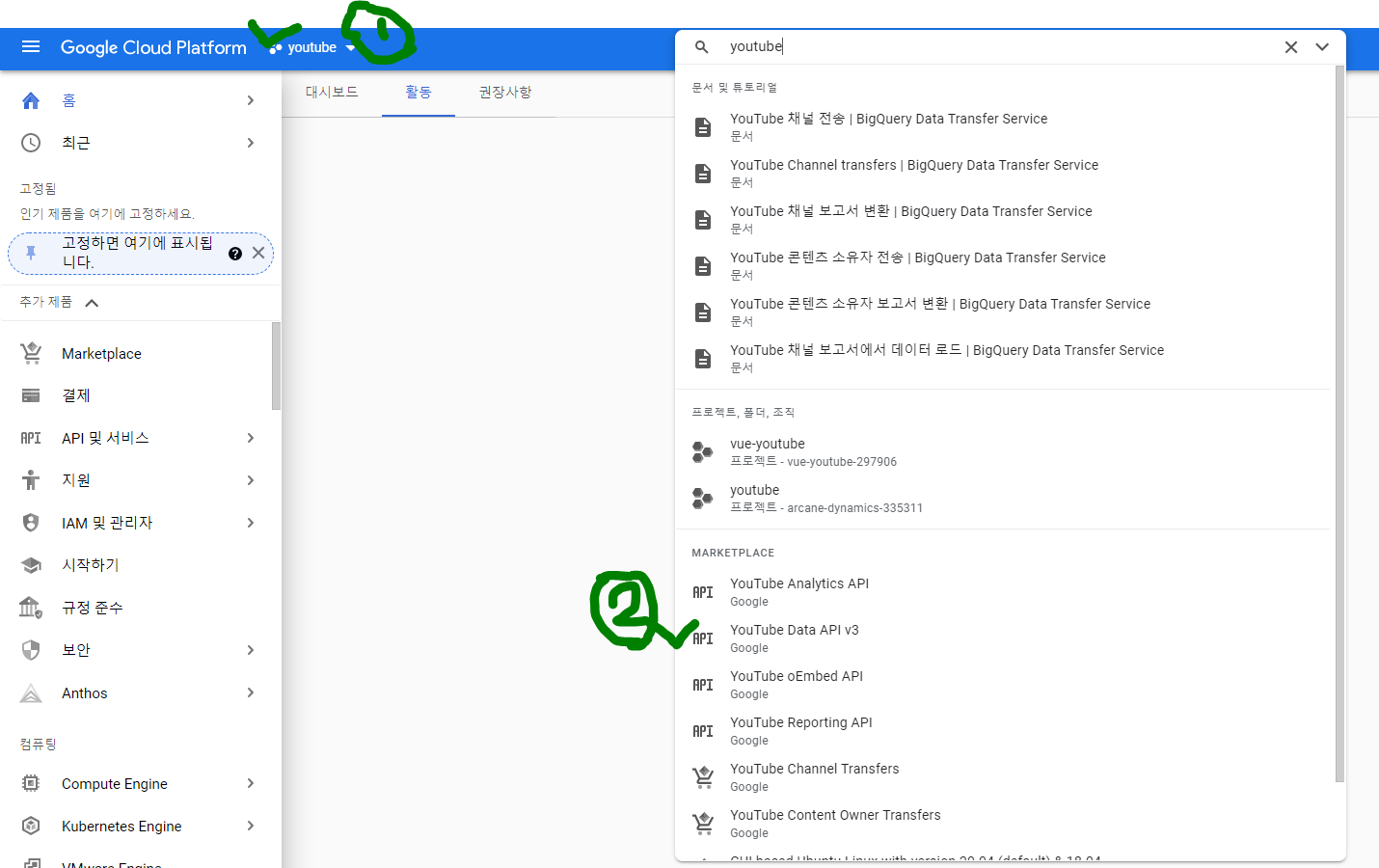 생성한 프로젝트를 누르고 youtube를 검색 후에 youtube Data API v3을 눌러준다.