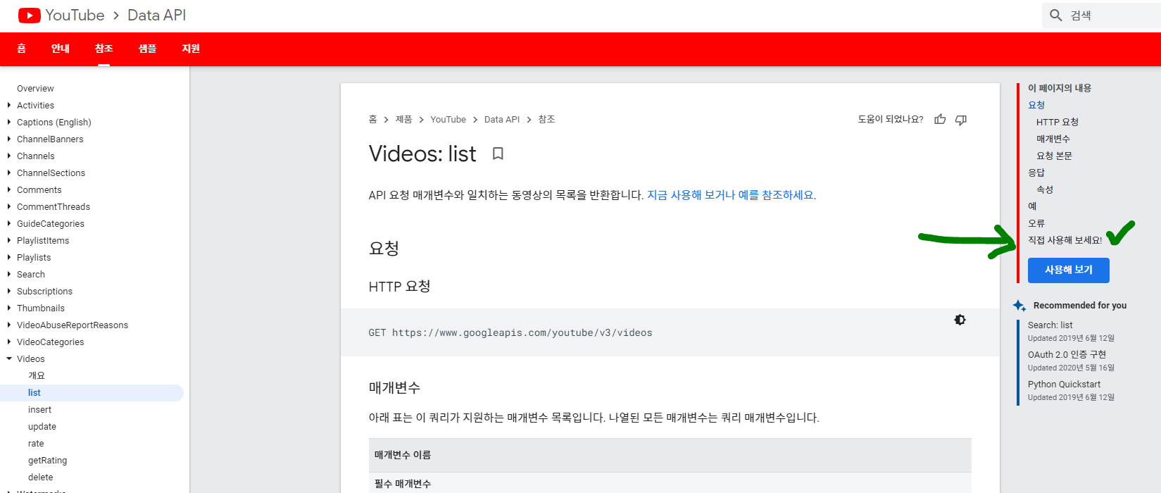 Videos: list API 요청 매개변수와 일치하는 동영상의 목록을 반환합니다. 지금 사용해 보거나 예를 참조하세요. 요청 HTTP 요청 GET https://www.googleapis.com/youtube/v3/videos 매개변수 아래 표는 이 쿼리가 지