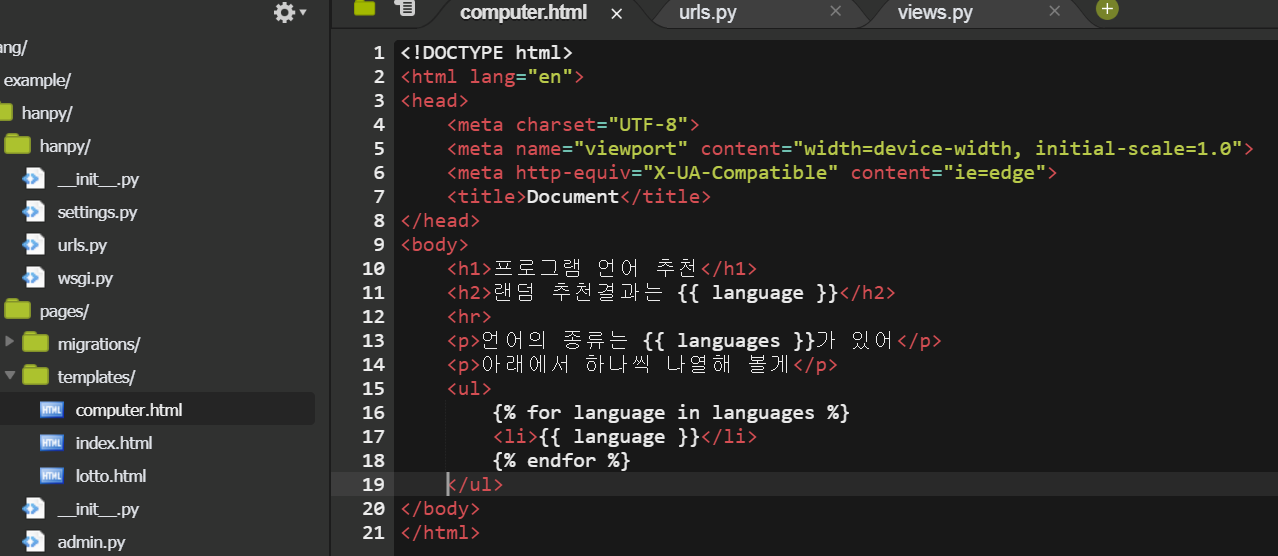 이러한 문법을 DTL(Django template language)이라고 하는데 조만간 다룰 예정이다.