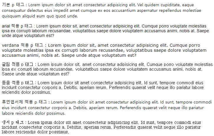 <p class="c">굴림 적용 p 태그 : Lorem ipsum dolor sit, amet consectetur adipisicing elit. Cumque porro voluptate molestias ipsa ex corrupti laborum recusandae, voluptatibus saepe dolore voluptatem accusamus animi, nobis at. Saepe unde atque voluptatum est?</p>