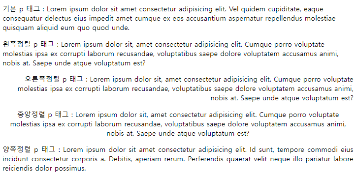 <p class="c">중앙정렬 p 태그 : Lorem ipsum dolor sit, amet consectetur adipisicing elit. Cumque porro voluptate molestias ipsa ex corrupti laborum recusandae, voluptatibus saepe dolore voluptatem accusamus animi, nobis at. Saepe unde atque voluptatum est?</p>