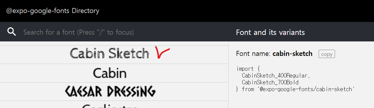 나는 여러 폰트 중에 Canin Sketch라는 폰트를 사용한다고 가정을 하고 글을 적어보겠다. 오른쪽에 나와있는 아래의 코드를 복사한다. 그리고 @expo-google-fonts/cabin-sketch로부터 코드를 가지고 오기 때문에 추가로 패키지를 설치해 준다.