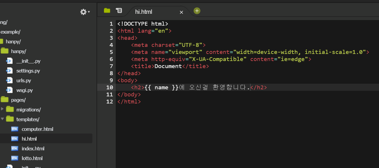 templates 폴더 안에 hi.html 만들어서 위와 같이 작성한다.