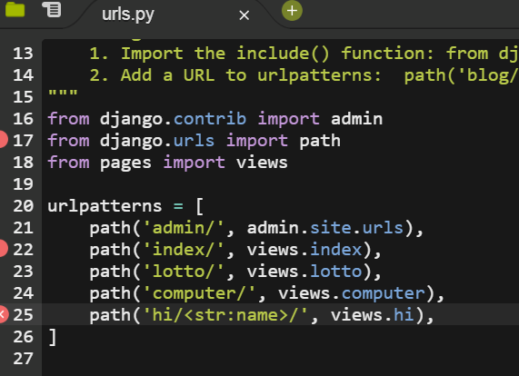 `path('hi/<str:name>', views.hi)`를 하면 hi/뒤에 값을 변수로 받겠다는 설정이다.