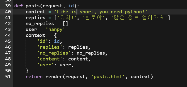 - context 안에 key값과 value 값을 같게 하는 이유는 views에서 넘어온 변수를 확인하기 위해서다.(편의상)