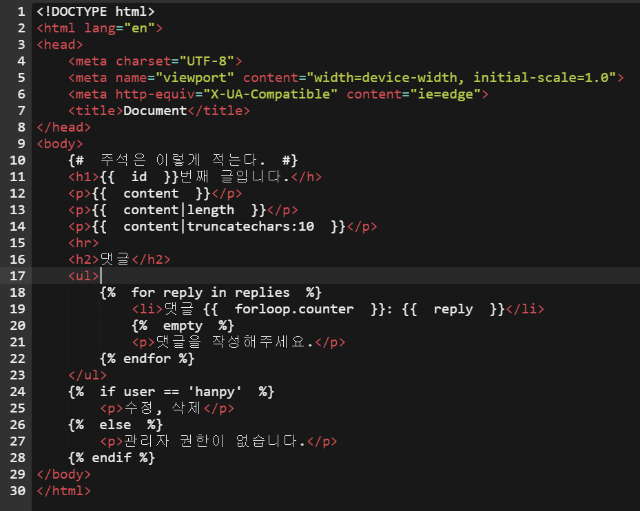- {{ empty }}의 예는 for 문으로 댓글을 출력 할 때, 댓글이 없는 경우 아래와 같이 사용가능하다.