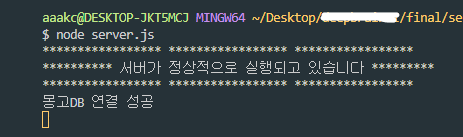 서버를 실행해 보자. 그러면 아래와 같이 찍힌다면, 몽고DB도 연결을 한것이다.