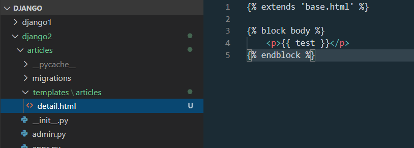 위치는 생성한 프로젝트 안에서 templates 폴더를 하나 만든다. 위의 트리를 보면 articles라는 app도 생성해놨다.