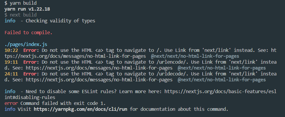 Error: Do not use the HTML <a> tag to navigate to /urlencode/. Use Link from 'next/link' instead. See: https://nextjs.org/docs/messages/no-html-link-for-pages