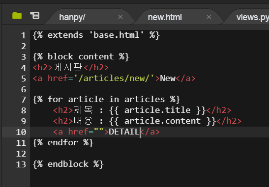 articles 라는 app 안에 templates를 만들고 그안에 articles라는 파일을 하나 더 만들어서 그안에 index.html을 넣었다.