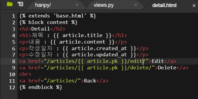 이 때 'articles/index.html'은 내가 views를 적은 후 에 만들 index.html 위치를 미리 적은거다.