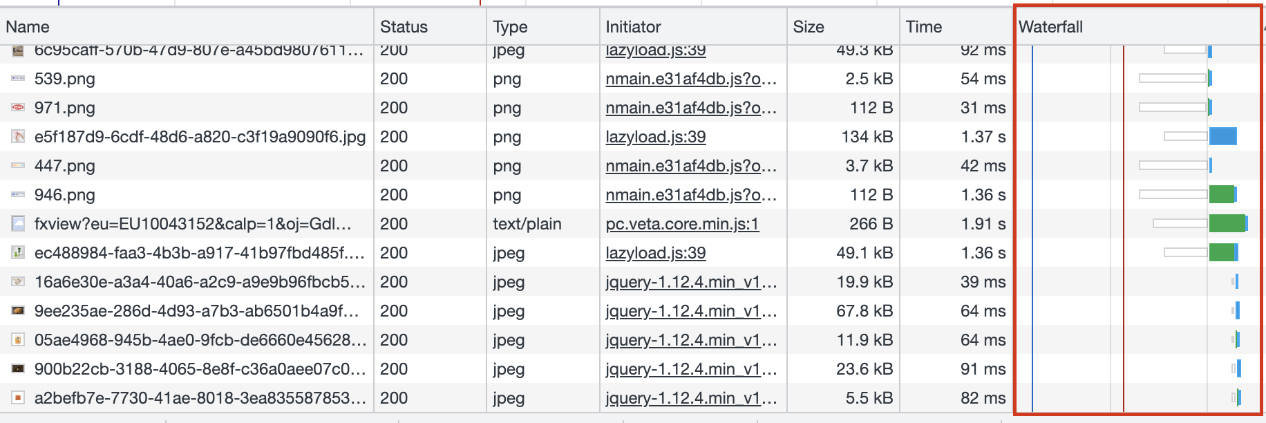 위의 사각형 부분의 Waiting for server response 부분이 바로 TTFB 부분이다. 1.32s 가 걸린 것을 알 수 있다. 1.32s가 걸린다면, 무좋은 좋지 않을 웹사이트일까? 그렇지는 않다. 이미지도 용량에 따라서 오래걸리는 부분이 당연히 있다고 할 수 있다. 이러한 경우는 렌더링 페이지가 다 생성 후에 다중에 lazy loading 하는 방식으로 사이트를 만드는 것이 좋다.