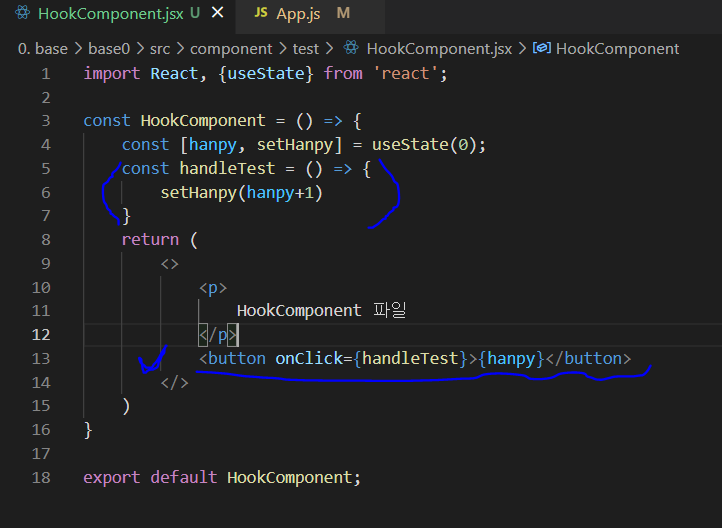 - []의 두 번째 변수 setHanpy : 변수 변경은 이것을 사용해서 한다. 통상적으로 첫 번째 변수인 hanpy에서 앞에 set을 붙여 사용한다.