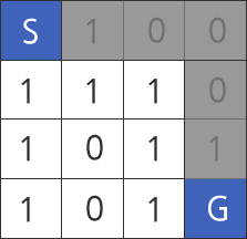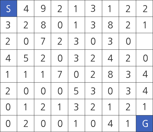 출발지는 좌상단의 칸(S)이고 도착지는 우하단의 칸(G)가 된다.